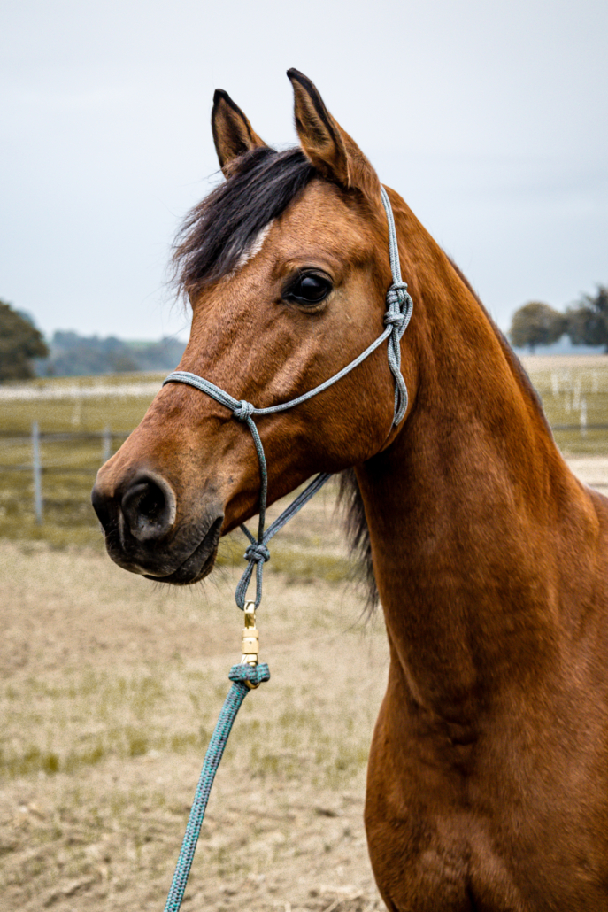 Grâce à la finesse et la souplesse de la corde, le licol est agréable à porter et permet de jouer entre les phases d’inconfort-confort pour l’apprentissage du cheval.